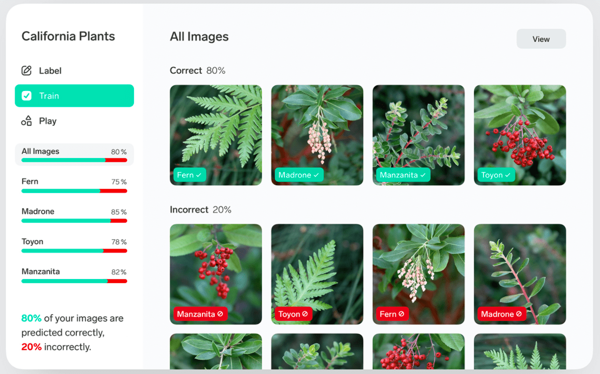 Handig aan Lobe, is dat gebruikers de prestatie van de app in real-time kunnen opvolgen, feedback kunnen geven op voorspellingen en foute resultaten kunnen bijsturen, zoals afbeeldingen die een fout label krijgen toegekend.