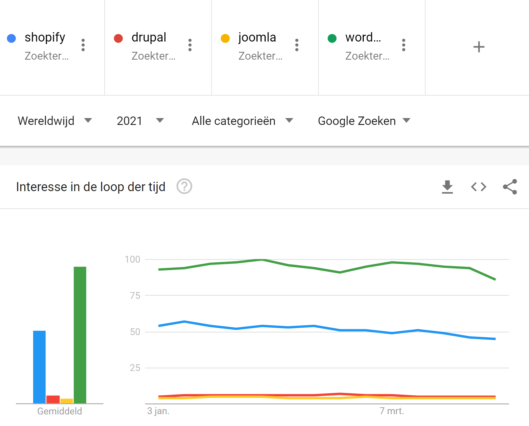 #13 In het rapport van Google Trends zien we Shopify als nummer 2 qua populariteit. Shopify is specifiek gemaakt voor het bouwen van webshops. Het moet 1 webshopsysteem voor zich dulden: WooCommerce. Die laatste is een exclusieve plugin voor… Juist, WordPress.