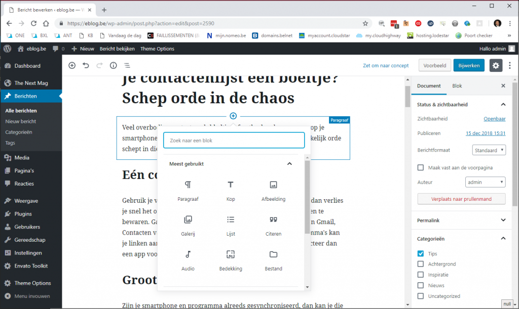 De belangrijkste vernieuwing van WordPress 5 is de nieuwe editor Gutenberg, een blok editor waarmee je gemakkelijk – zonder html kennis –een webpagina kan opbouwen. Het belangrijkste voordeel is dat ieder artikel erop een uniforme manier uitziet. De nieuwe manier van werken