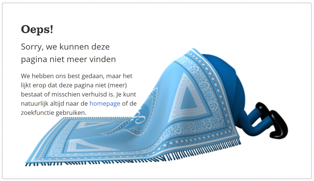 Leg bezoekers uit wat er is misgelopen. Dat doe je kort en krachtig. Goede voorbeelden zijn “Sorry, deze pagina is niet meer beschikbaar” of “Oeps! De pagina die je bezoekt bestaat niet, is verplaatst of verwijderd”.