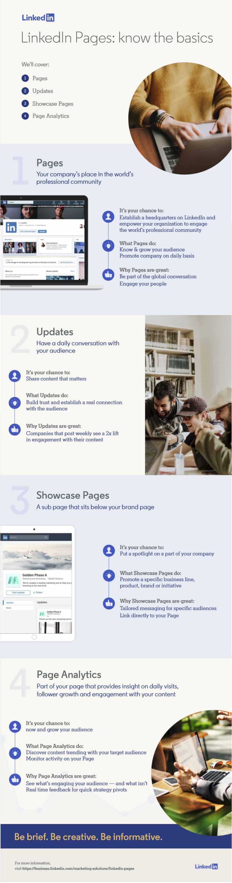 LinkedIn heeft de mogelijkheden van bedrijfspagina’s de voorbije jaren sterk uitgebreid. Het social mediakanaal heeft zelf vier basiselementen uitgelicht in een infographic (zie onderaan): je pagina, het publiceren van updates, showcases en analyses.