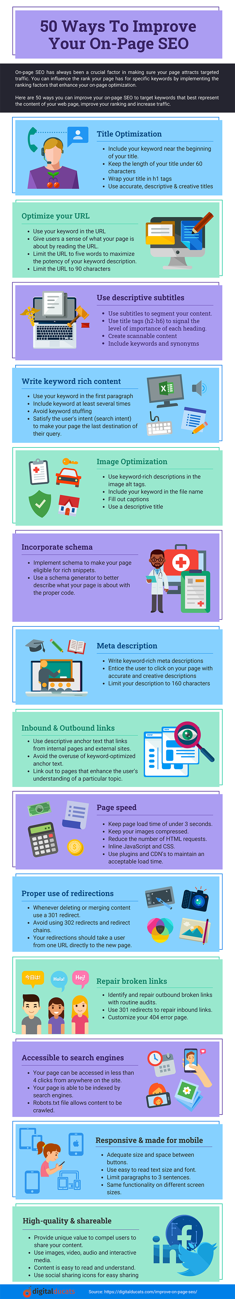 De 50 tips om de on-page SEO van je website te verbeteren in de infographic zijn een handige leidraad om je website eens onder de microscoop te leggen. Wat je zoal kan doen?