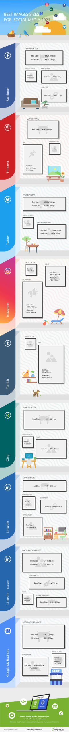Voor je ‘t weet, ben je uren tijd kwijt aan het regelen van je afbeeldingen op Twitter, Instagram en andere sociale media waarop je actief bent. Niet zo met de cheat sheet van Blog2Social. In de infographic onderaan vind je de afmetingen voor verschillende formaten op de belangrijkste socialmediaplatforms terug.