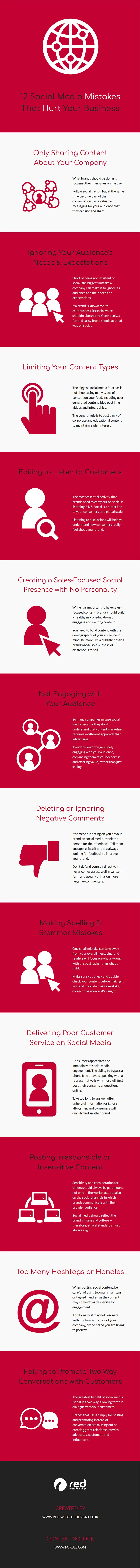 Red Website Design heeft in een infographic 12 veel voorkomende fouten op sociale media verzameld. Fouten die niet alleen nieuwelingen, maar ook mensen die al een stevige dosis ervaring met sociale media soms nog maken.